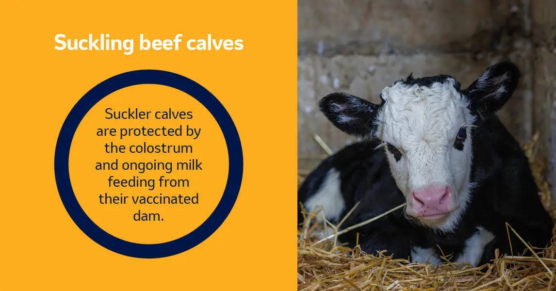 Protection of calves depends on adequate ingestion of colostrum and transition milk from vaccinated cows and heifers.