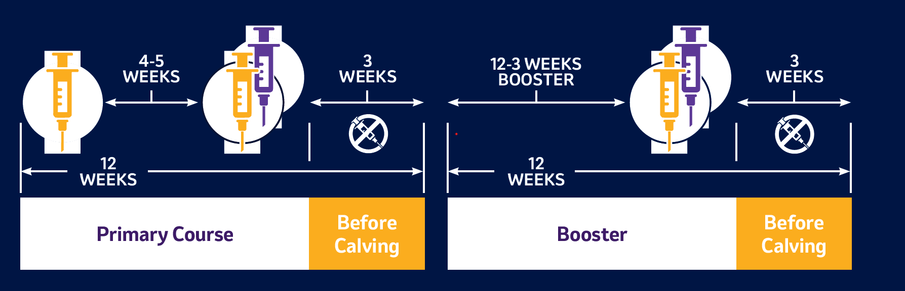 Primary Course: 2 doses (SC), 12-3 weeks before calving, 4-5 weeks apart*.